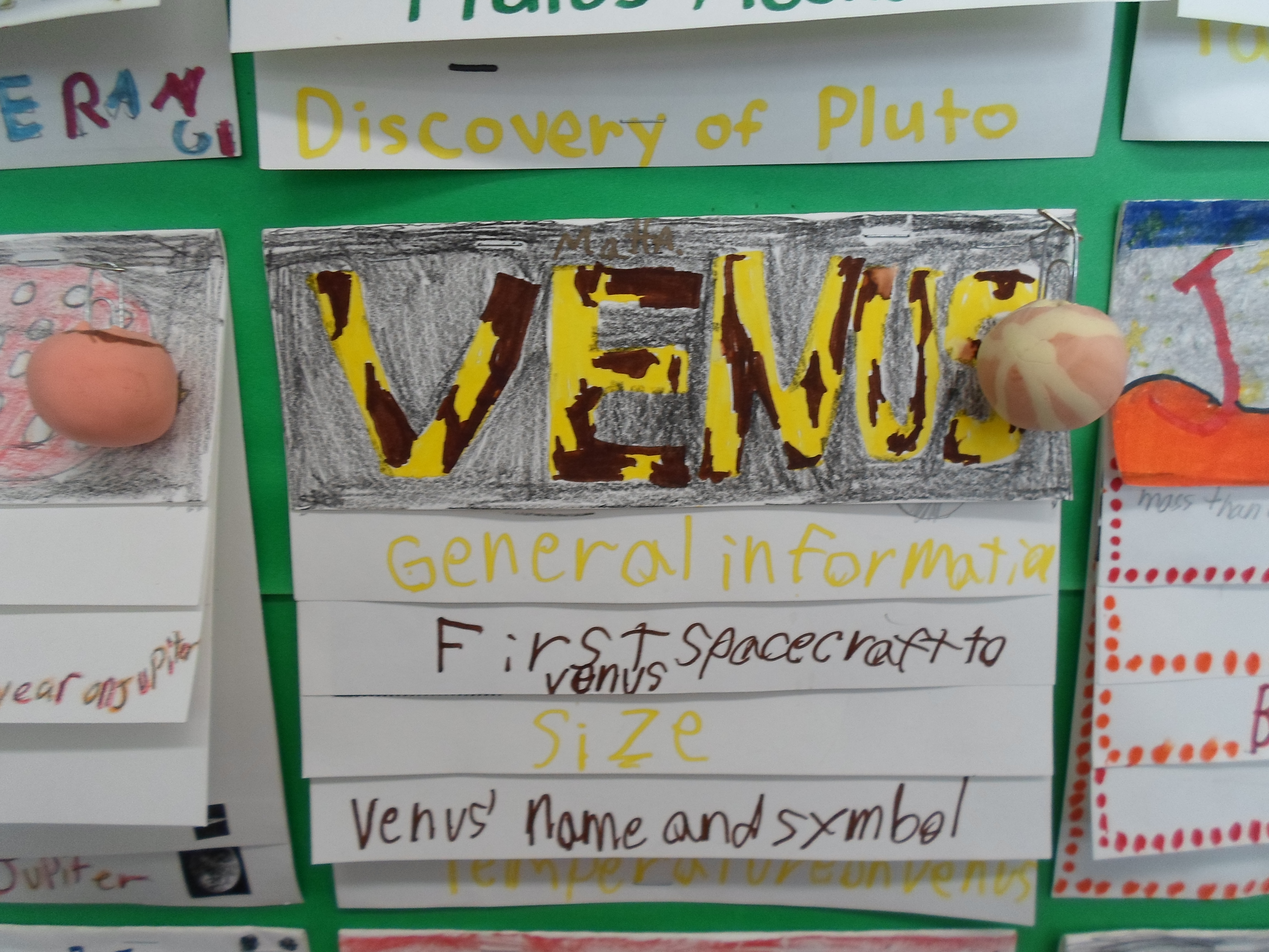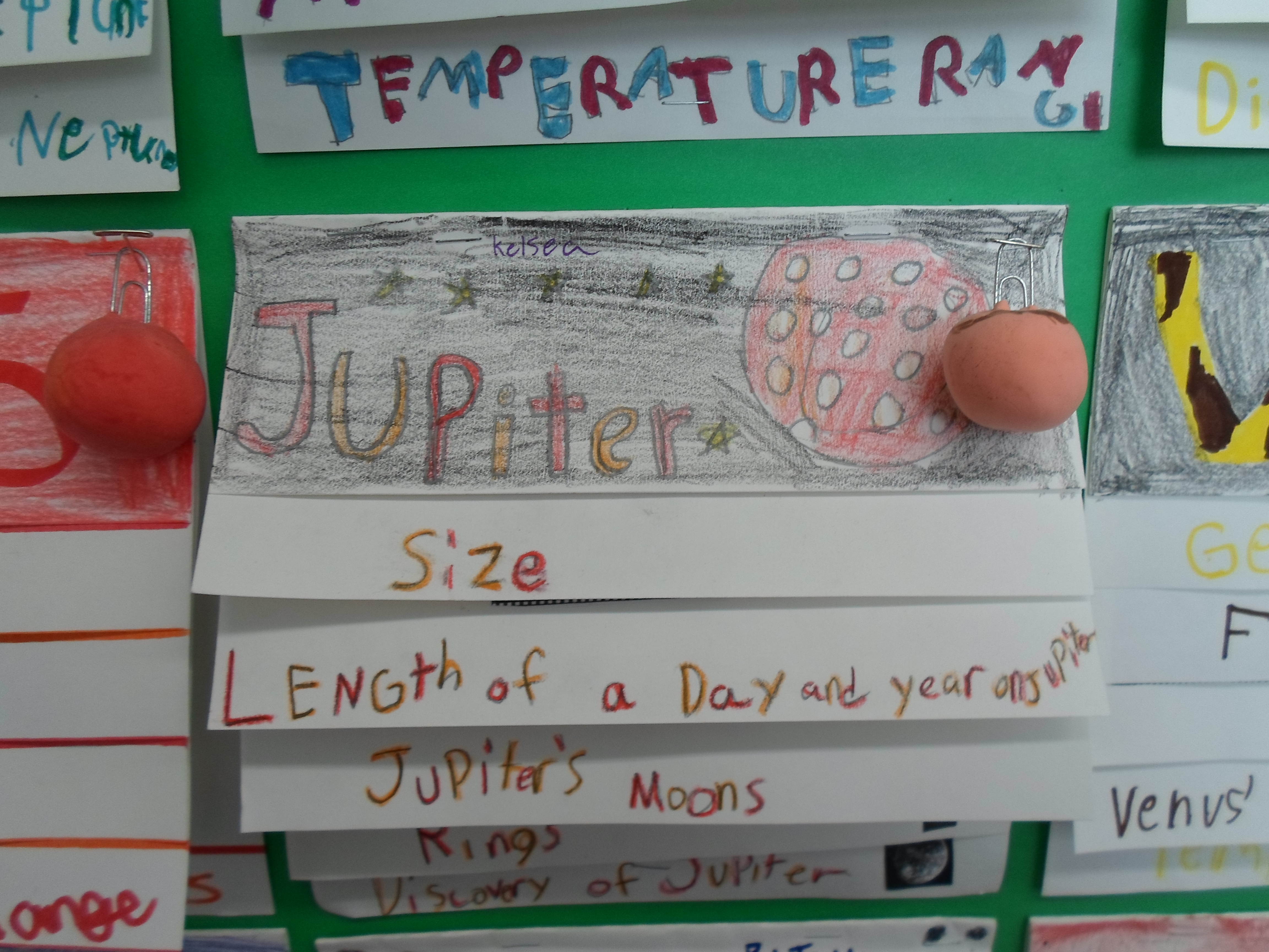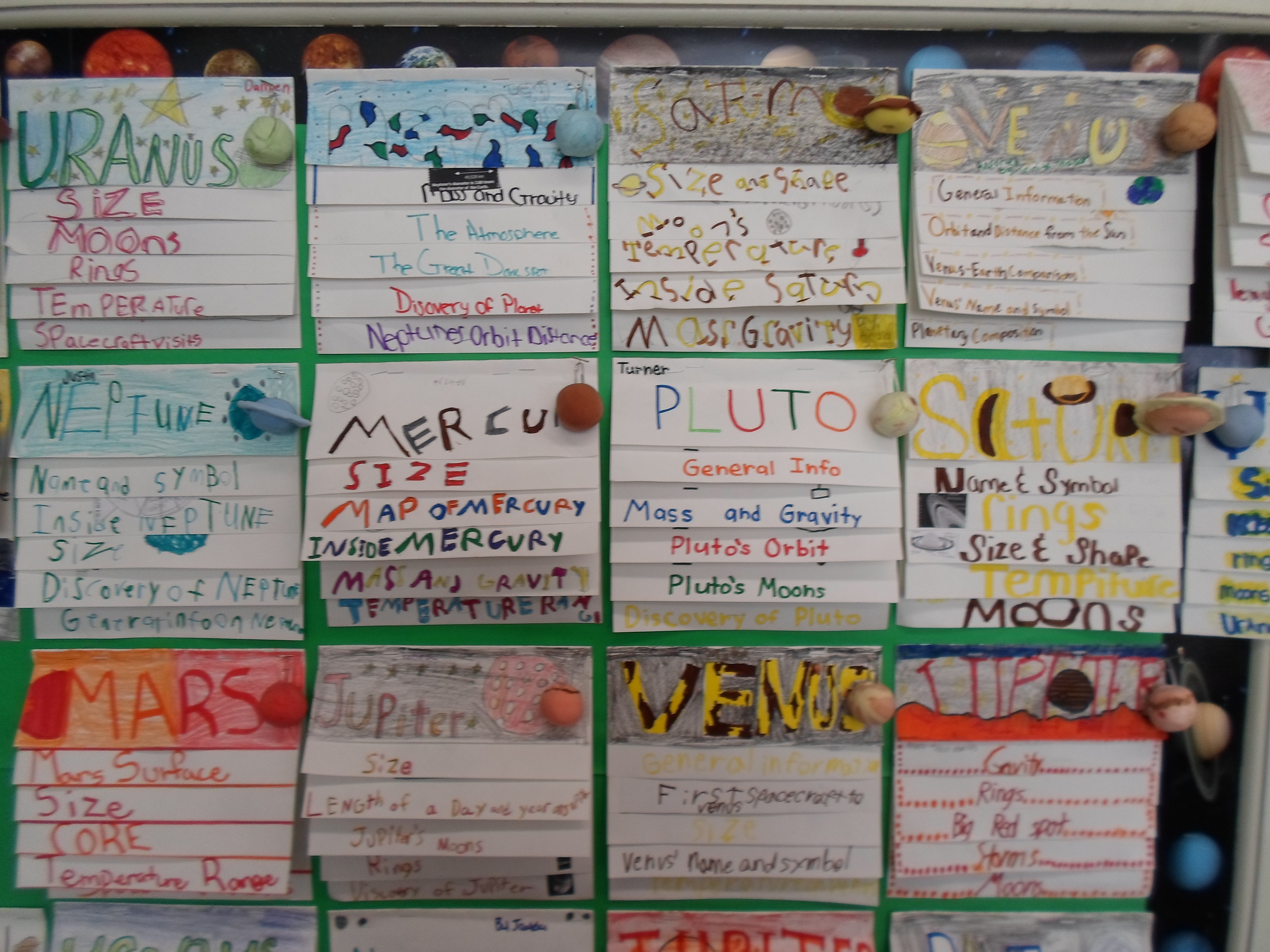 The information on the Enchanted Learning website has headings and sub-headings (non-fiction text feature mini-lesson) and so the students used those on the different flaps of their flapbooks. The labels for the flaps are unique for each planet since some have moon, while others have rings, etc. We decorated the title using crayons and markers. They were supposed to use a color scheme related to the planet!