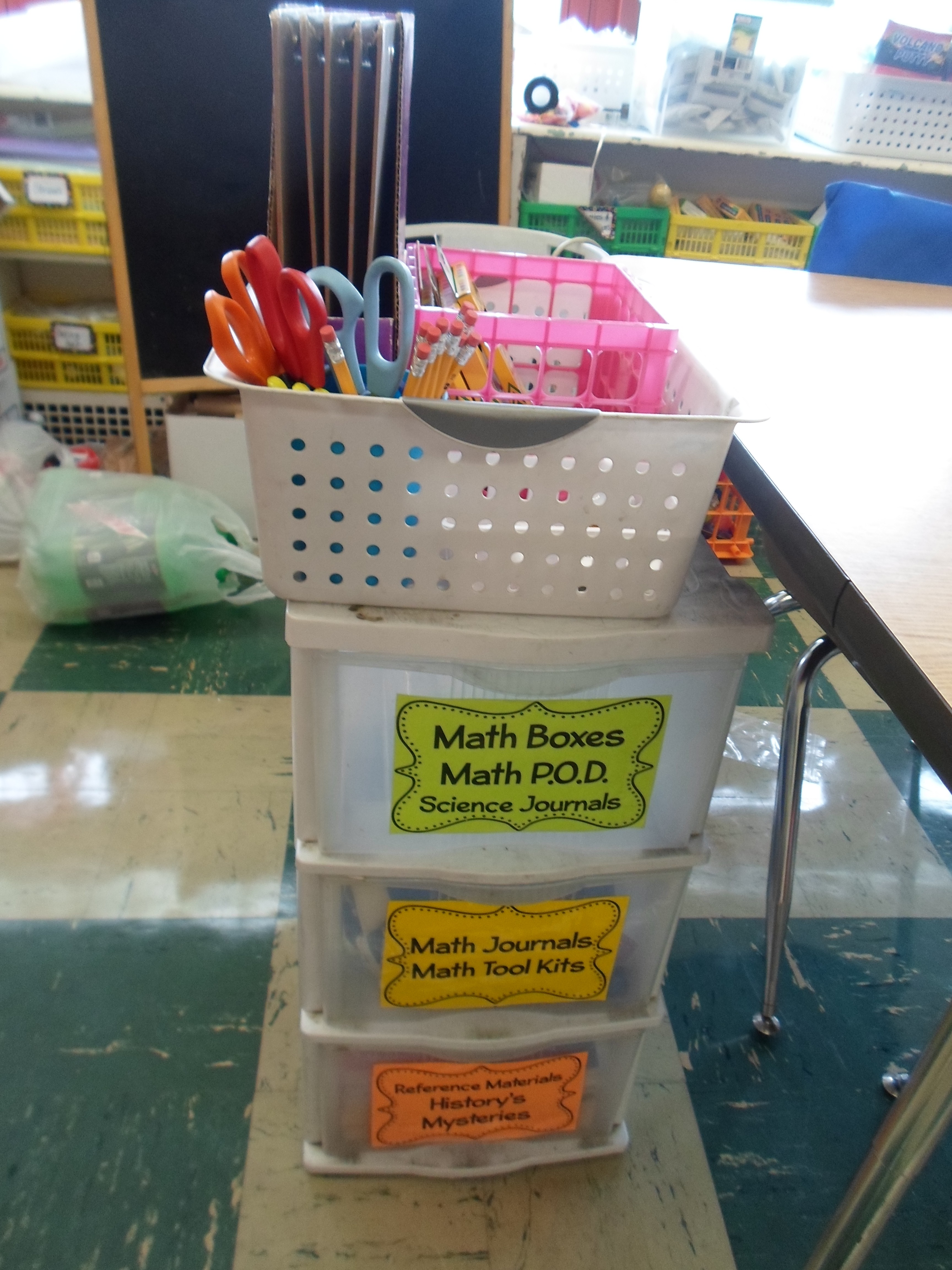 I use these three drawer carts for my table supplies.  They have actually held up quite well (I have had them for 7 years)!  I put labels on the drawers.  In the top drawer, we have Math Boxes, Math Problem of the Day, and Science Journals.  In the middle drawer, we have Math Journals and Math Tool Kits.  In the bottom drawer, we have Reference Items.  A basket sits on the top of each three drawer cart and the table supplies are in this basket.  There are scissors, glue sticks, liquid glue bottles, white-out, crayons, markers (thick and thin), colored pencils, hi-lighters, sharpened pencils, a hole punch, a pencil sharpener, and black Sharpie markers in the basket.