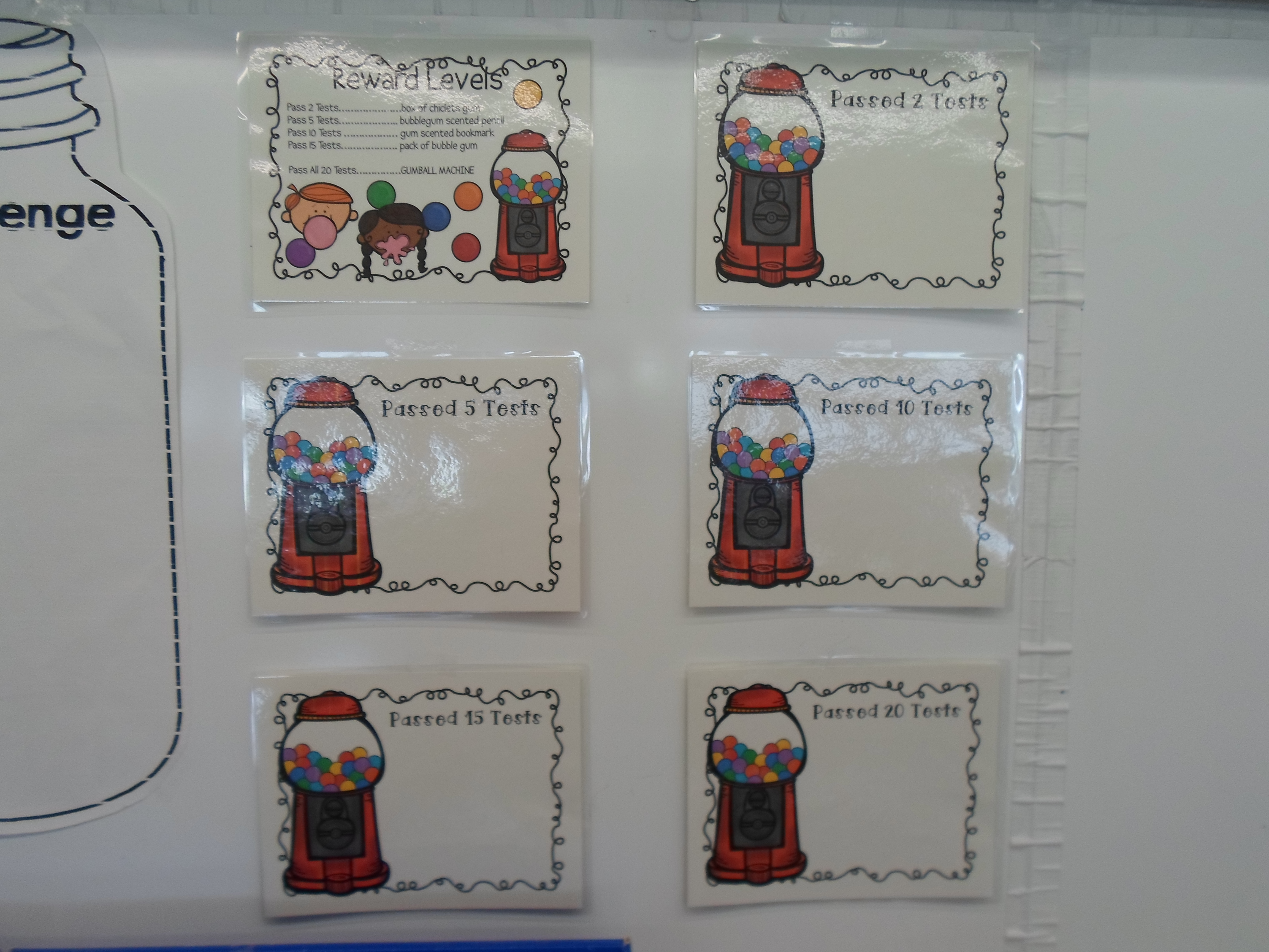 We start by making little gumball machines for each student. I get chart stickers that look like gumballs. Here is the link to these stickers. Students color and decorate their own gumball machine with their name and the stickers. I move these mini-gumball machines from chart to chart as students pass a certain number of times tests (at a 95% accuracy rate) and earn the different prizes.