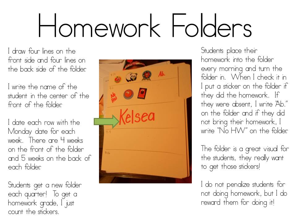 Each day students turn their homework in using a Homework Folder. It is a letter-sized manila folder. On the folder there are dates written for each week of the quarter. Students get a sticker (they love stinky stickers) every day they bring their homework back.