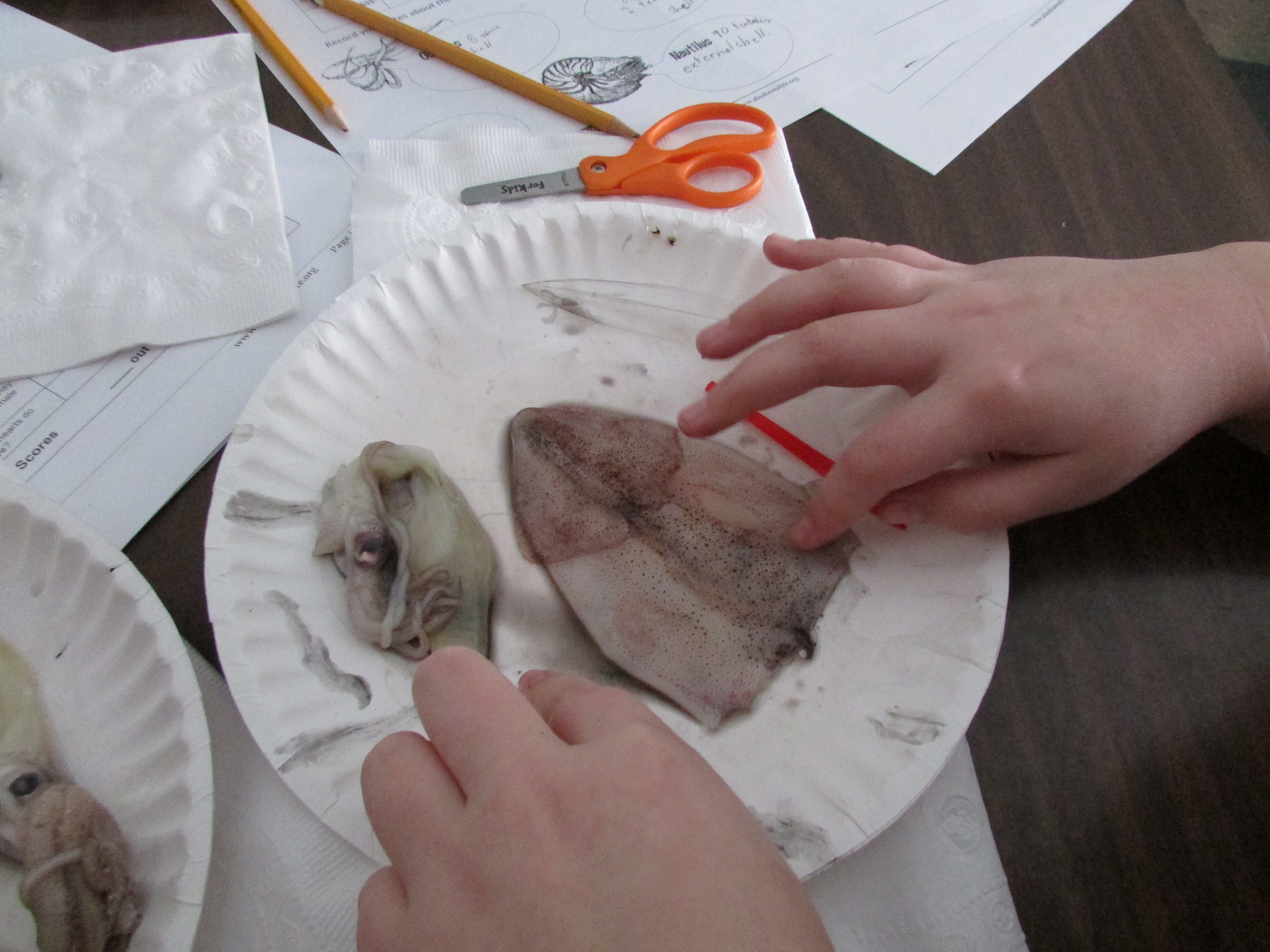 The SeaLife Center sent us the squids, but you can find all three (octopus, cuttlefish, and squid) at most Asian markets. Just look in the frozen section! We thawed them all out in tubs of cold water.