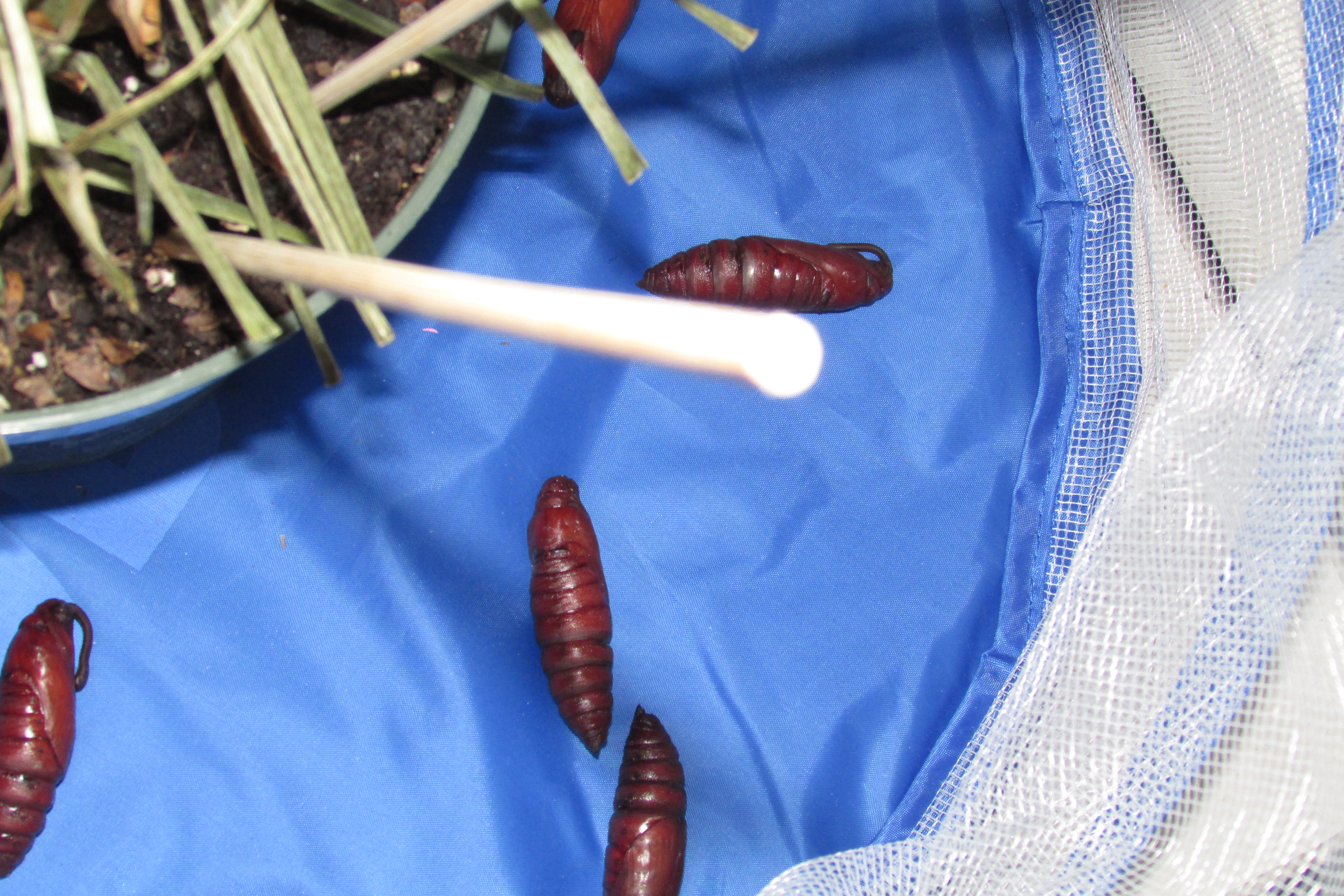 After a week, the pupa is formed and it can be transferred into the net cage. The moths will emerge in 3-5 days. These moths are supposed to be the size of hummingbirds! We can’t wait to see them!