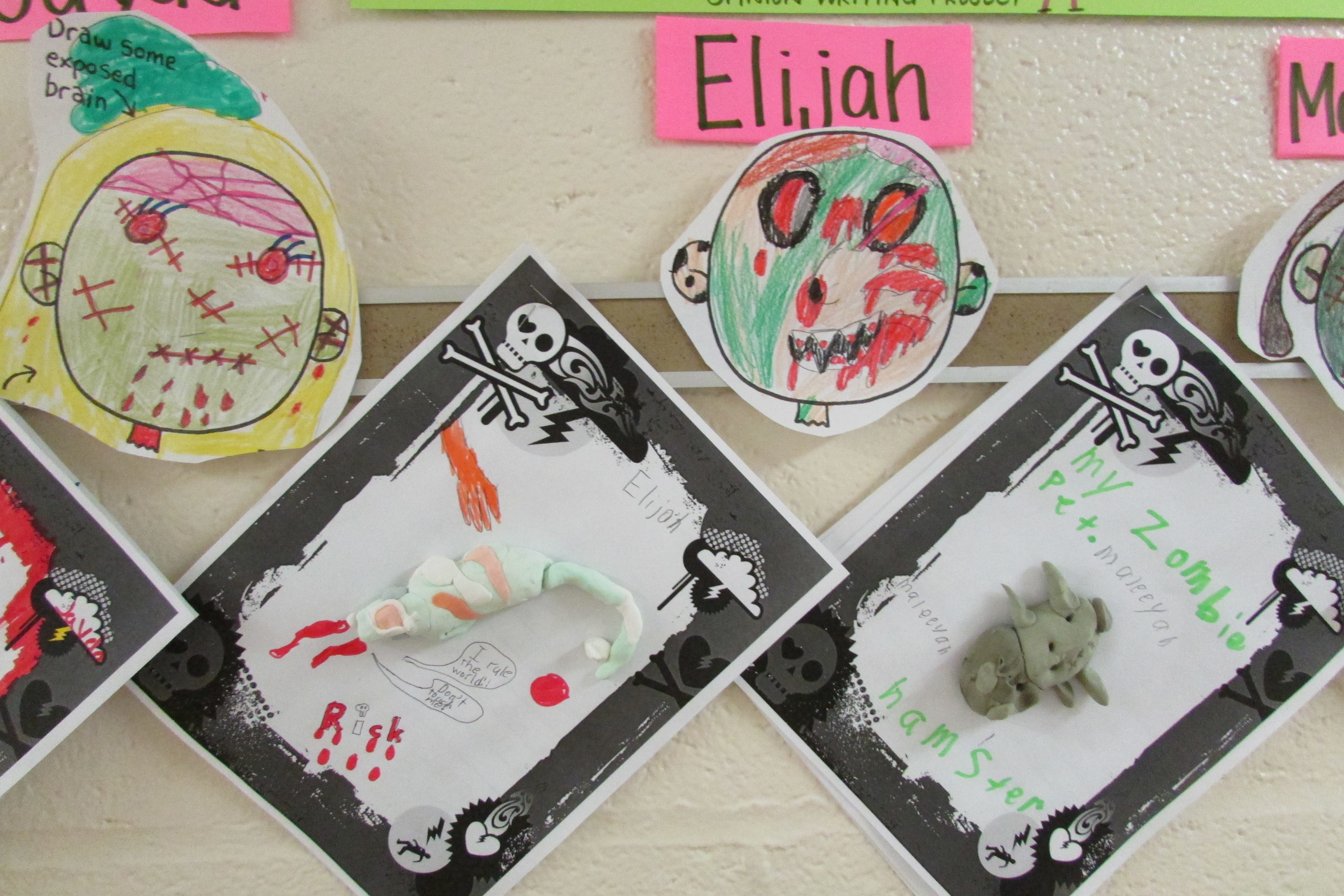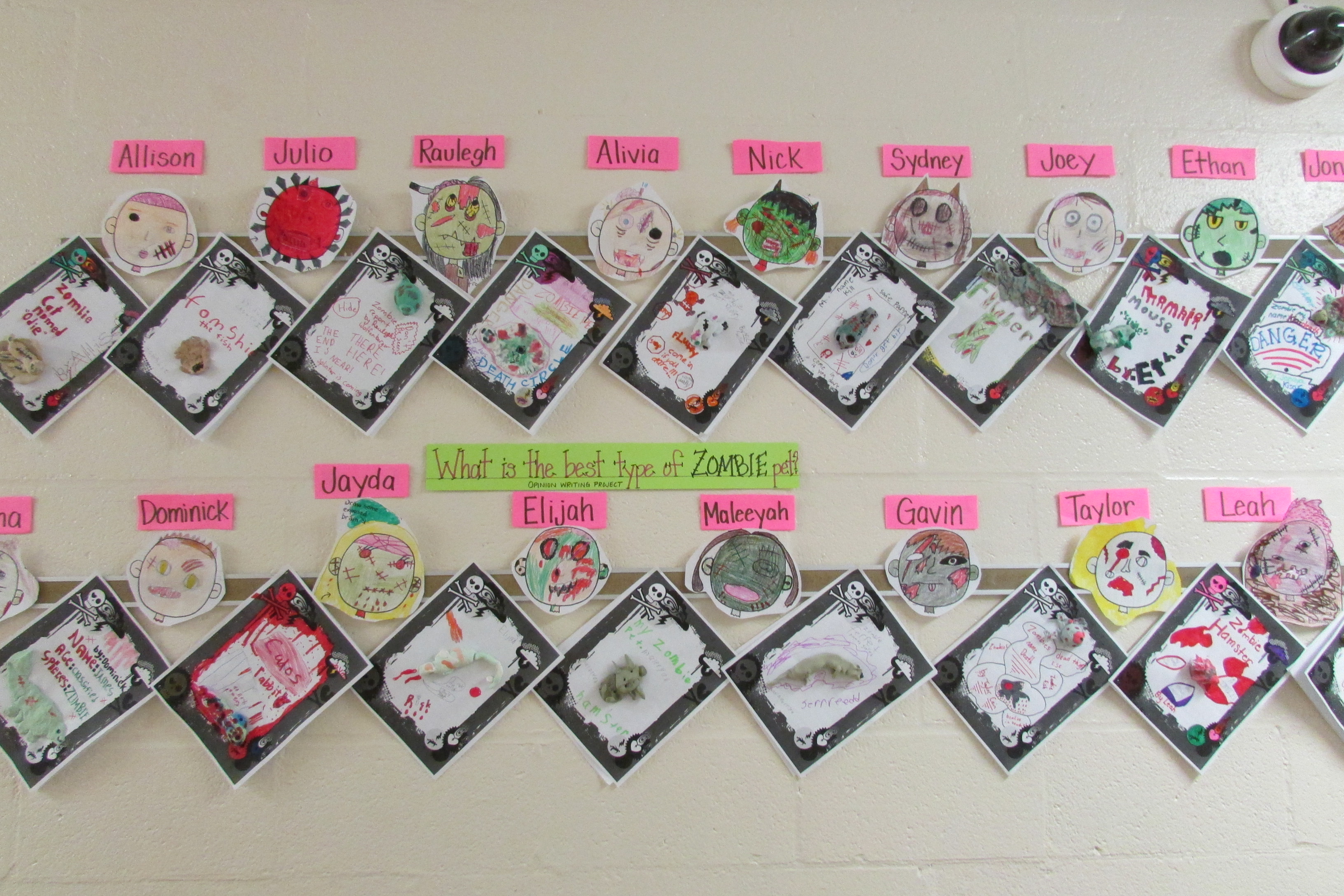 This writing project is always one of my kids’ favorites! My students wrote persuasive essays about the best type of zombie pet. They had to complete several pre-writing sheets in order to learn about different types of arguments, persuasive language, and the pros and cons of owning a particular type of zombie pet. Once students completed the rough draft, they revised and edited them and then worked on their final copy. They turned out great! We also made our zombie pets out of Crayola model magic, with all of those fun zombie elements: oozing brains, stitches, rotting flesh, bulging eyes, etc.