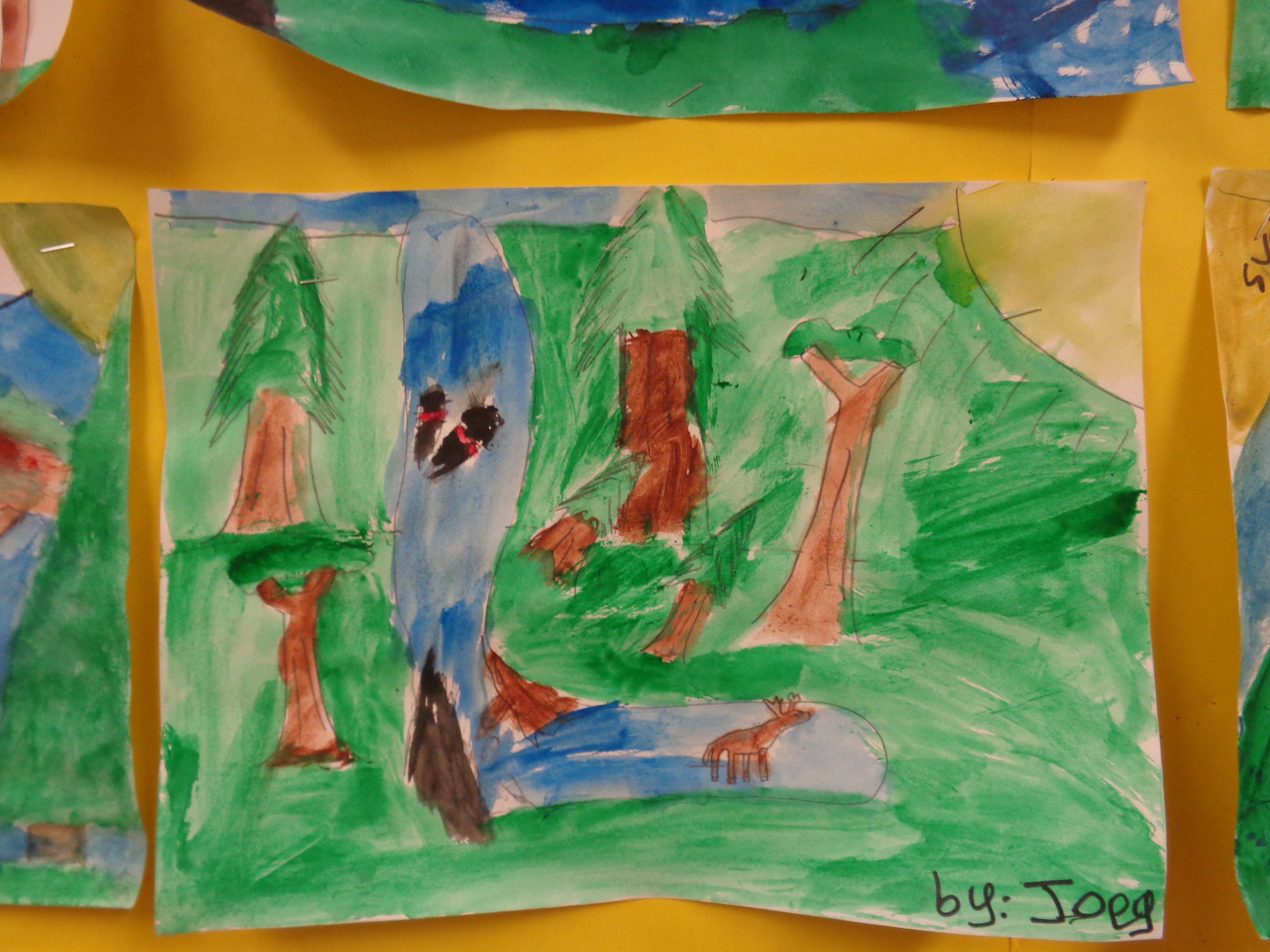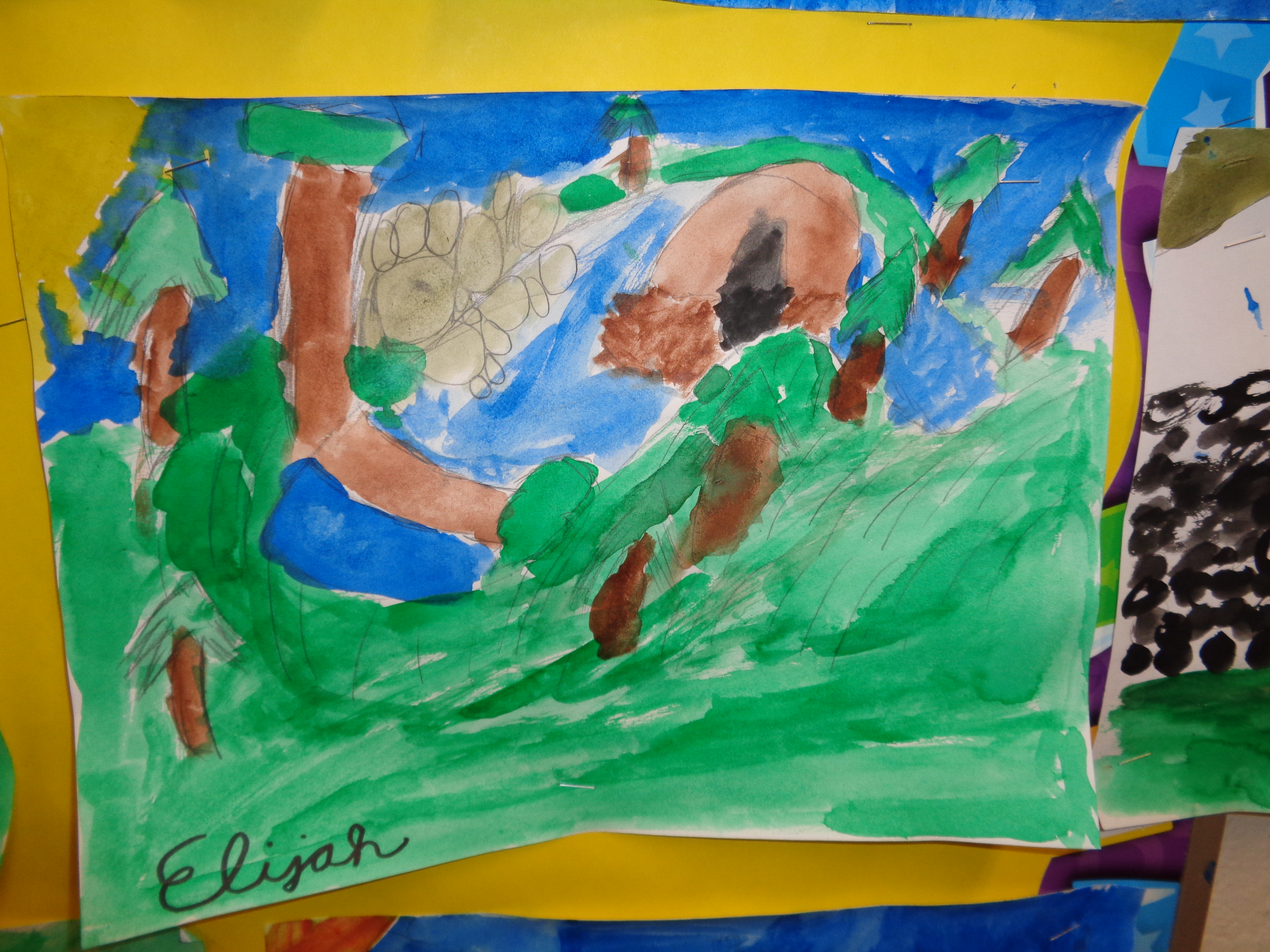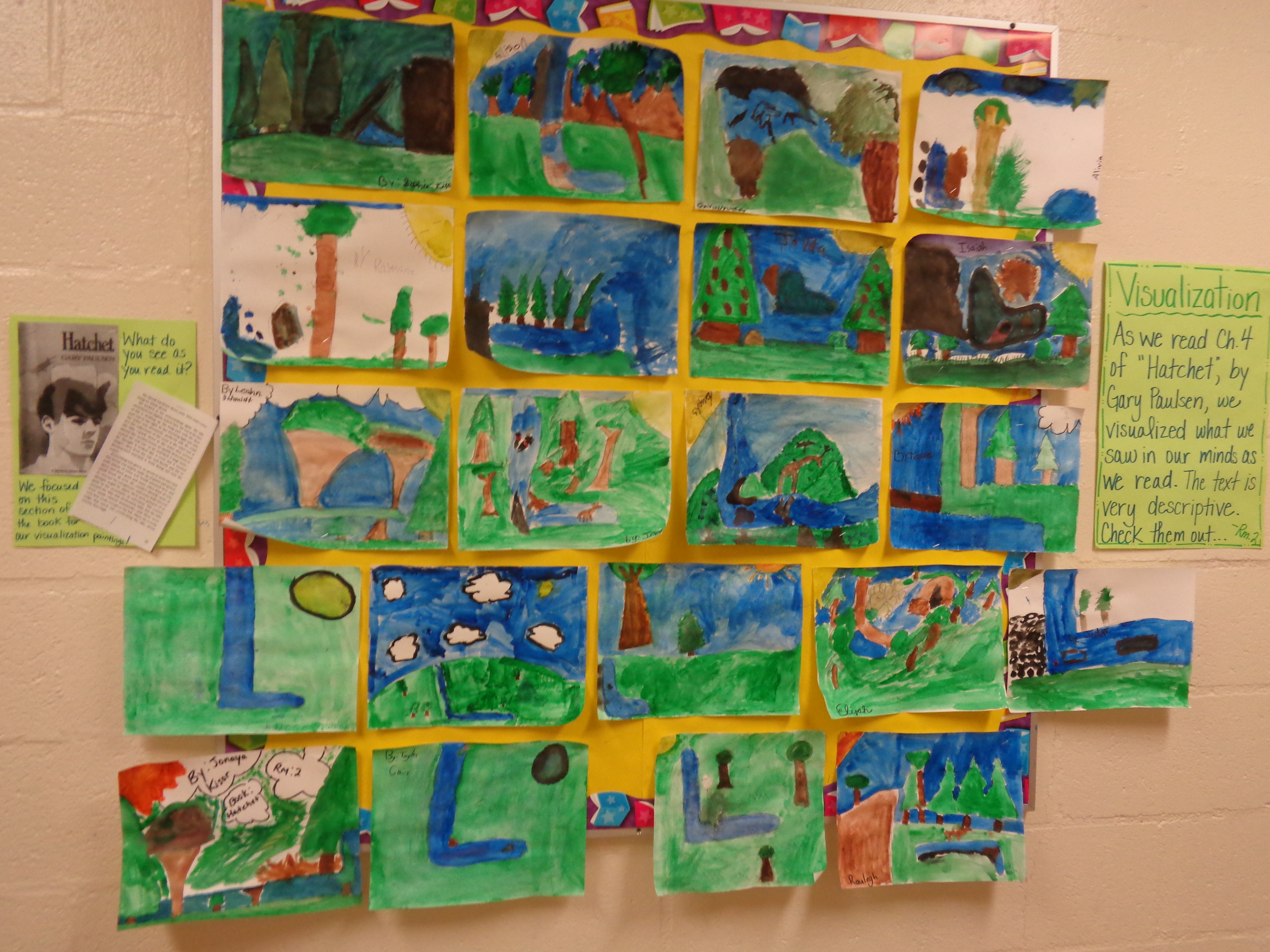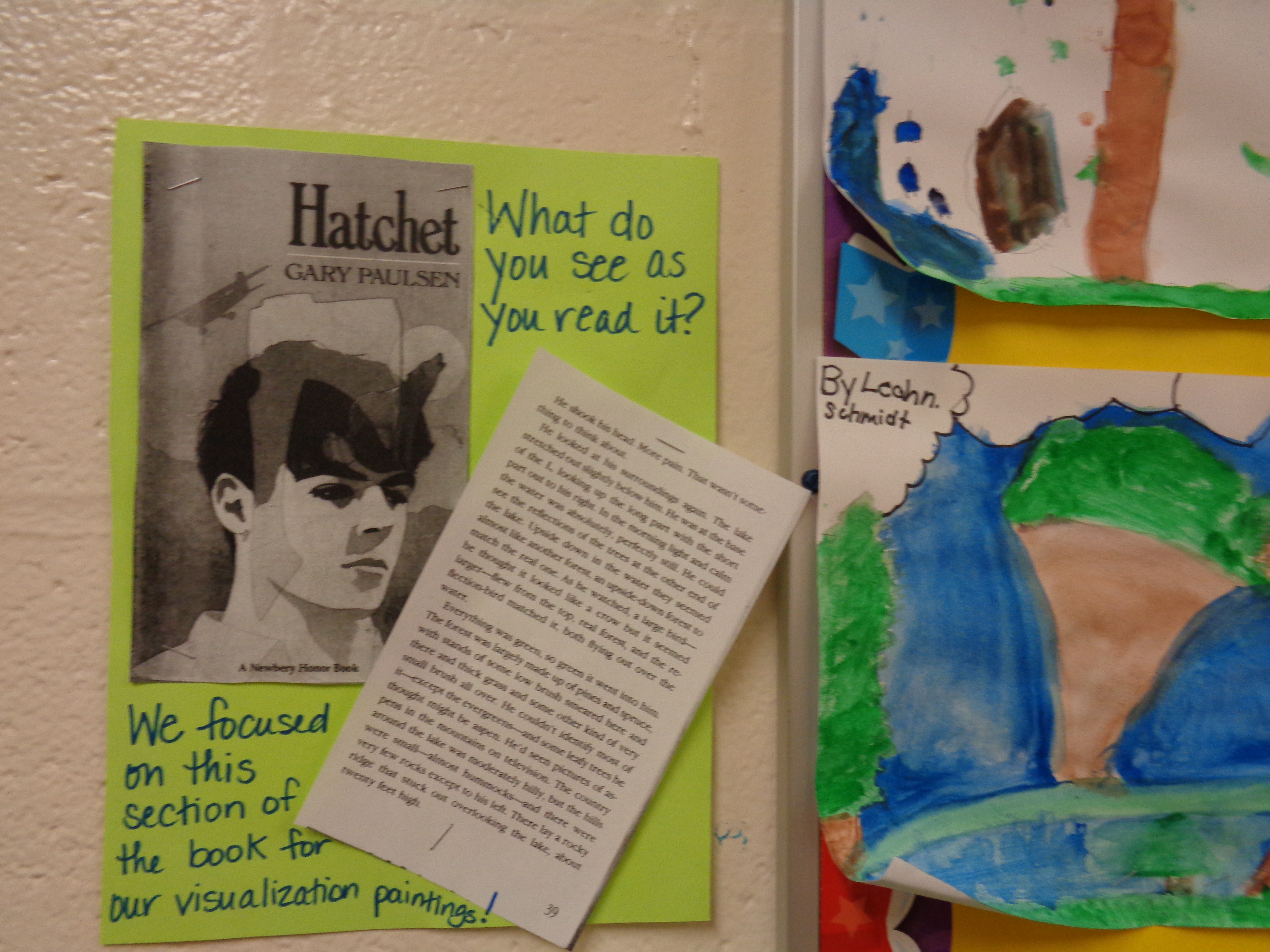 We are currently reading the book, Hatchet, by Gary Paulsen. We focus on several skills while reading the book. One of these skills is visualization. In this book, Gary Paulsen uses a ton of descriptive writing. We reread a section of the book and then the students had to use watercolor paints to show what they saw as they read this descriptive passage. We discussed and compared our visualizations in table groups and then displayed them in the hallway.