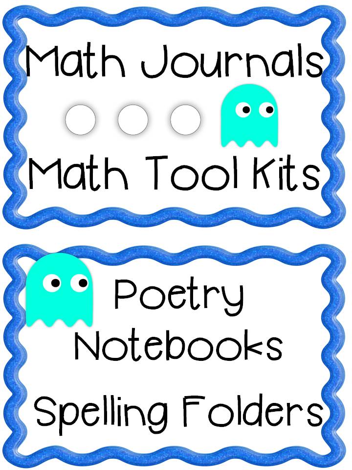 I give each student a plastic school box to put their personal supplies in since we share table supplies.  So I made Pac Man name plates (with each of the 4 ghosts and Pac Man and Ms. Pac Man) to tape to the top of the plastic school boxes.
