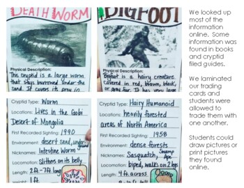 We use these informational posters to make Cryptid Trading Cards! My kids LOVE making these trading cards. I laminate them when they are completed and they love trading them with one another, and with me! There are few different versions of the cards included in the file you can purchase on TPT. Click here to grab this file for just $2!