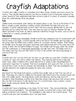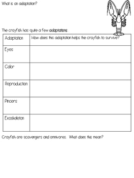 We end the 4th grade year with a science unit on Animal Adaptations and a focus on crayfish! This kids always look forward to this unit in May each year of 4th grade. I start by buying some live crayfish to keep in the classroom. I buy enough so each table group can have one crayfish to observe. These animal cannot be released into the environment, so I ask students to take them home as pets at the end of the unit. They are actually interesting to keep as pets! I keep the crayfish in a large plastic tub with a bubbler and places for the crayfish to hide. I use large cut PVC pipes that I hot glue into the tub before I had water. You need to also add water conditioner to get the chlorine out of the water. Crayfish eat lots of different things, including fish flakes, crayfish pellets, bloodworms, and even carrots. You can get live crayfish from a few different places like, bait stores, Carolina Biological, or Amazon.